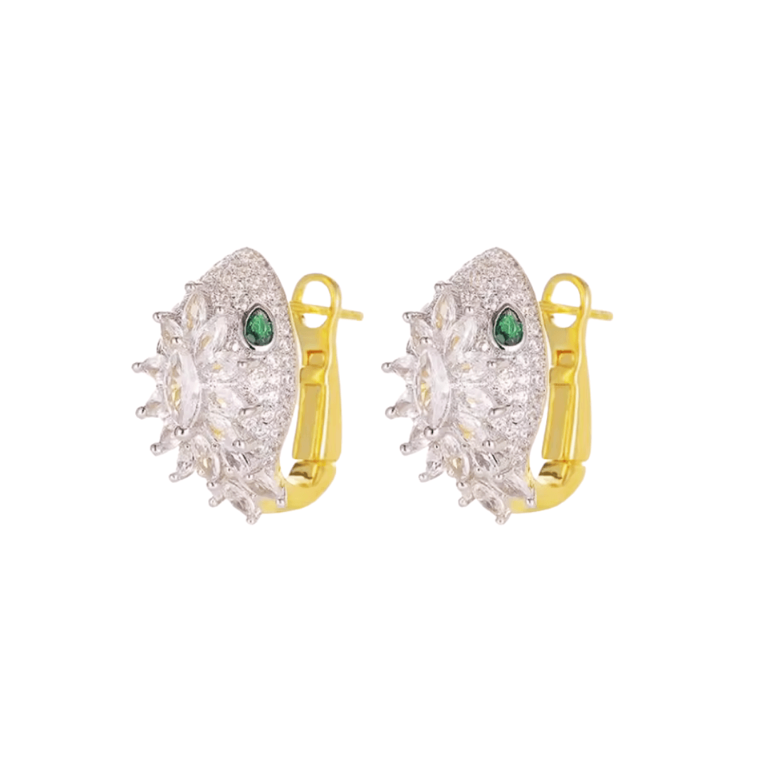 At the heart of each serpent design lies a striking emerald-green stone, cut in a teardrop shape to form the serpent’s eyes. These vibrant accents, framed in gold, add an aura of mystery and vitality. Green has long been associated with growth, renewal, and balance, giving the earrings a symbolic depth that makes them not only a fashionable accessory but also a meaningful piece. The combination of sparkling clear stones and bold green eyes creates a contrast that is both alluring and sophisticated.