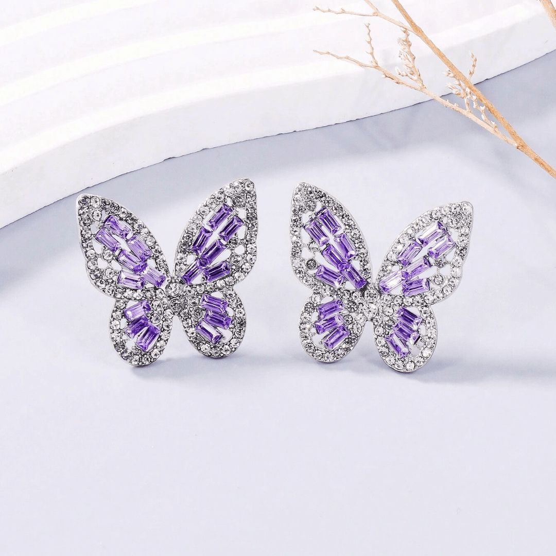 Crafted with high-quality workmanship, these earrings feature intricate butterfly detailing, highlighting the delicate wings and elegant curves that make this design so enchanting. The rich purple accents are carefully applied to catch the light, creating a luminous and eye-catching effect. Their polished finish enhances the overall elegance, making them suitable for both everyday wear and special occasions.